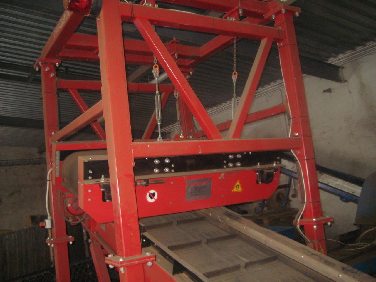 Przeznaczony do zawieszenia nad przenośnikiem taśmowym transportującym surowiec w celu odbioru Fe Wyposażony w blok magnetyczny z obiegiem taśmy zabierakowej służący do wychwytywania i automatycznego oddzielania metali żelaznych z transportowanego na taśmie surowca.